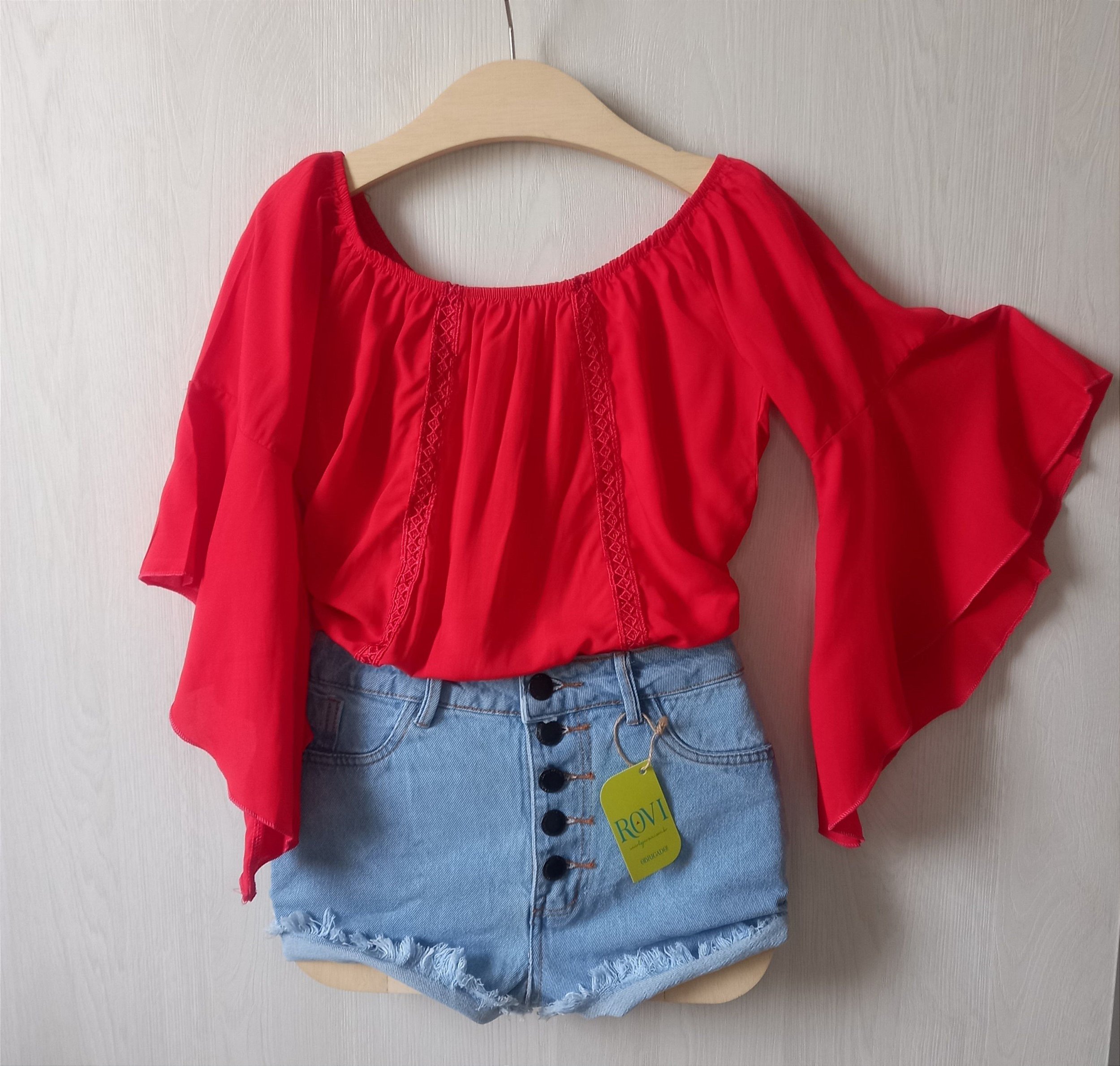 O modelo é ciganinha com elástico de ombro a ombro com detalhe em aplicação na parte frontal..
