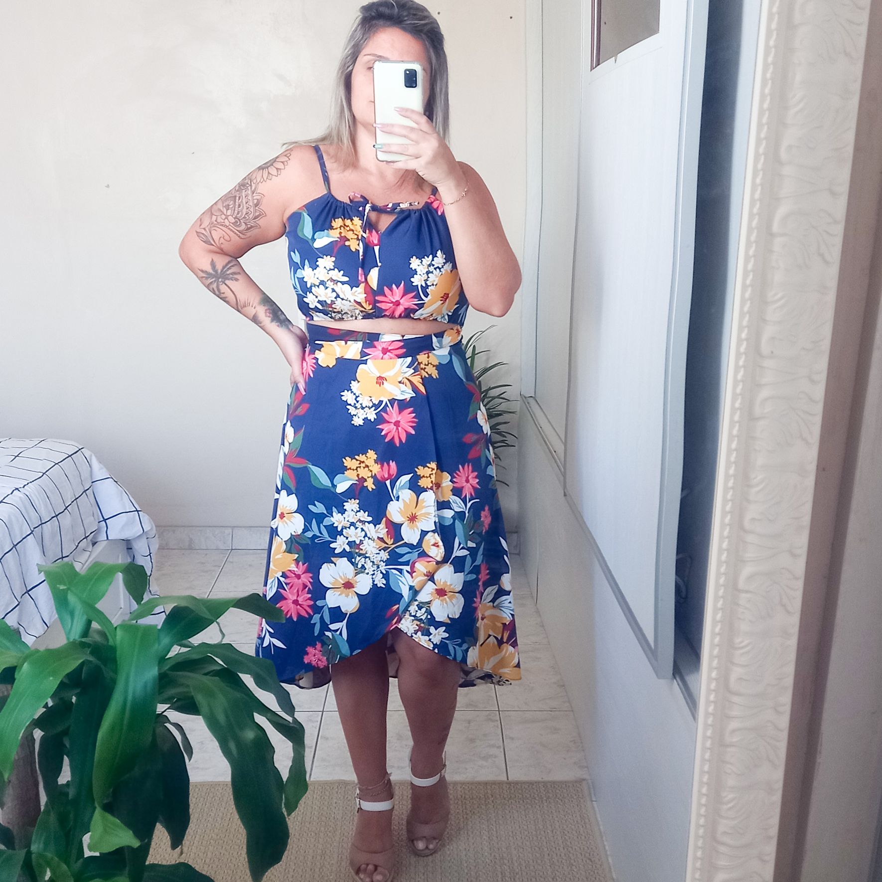 TAMANHO ÚNICO (VESTE DO 36 AO 42) Cropped com alças reguláveis. Saia envelope estilo mullet. Tecido: Crepe.