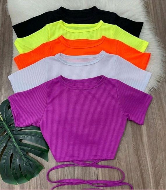O modelo é cropped com amarração frontal, manga curta bufante e decote redondo.