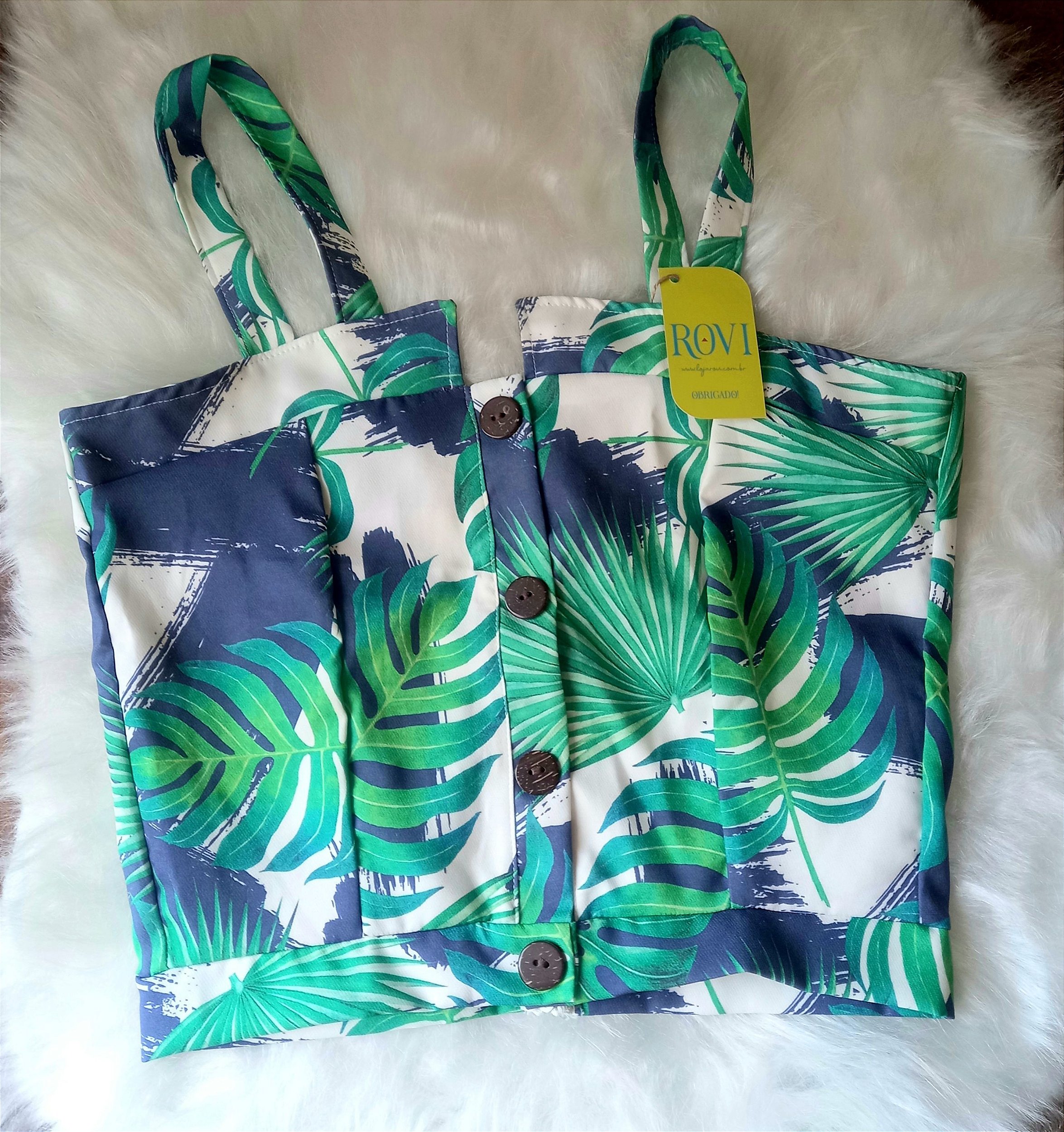 O modelo é cropped com fechamento em zíper na parte posterior e detalhe com botões na parte frontal.