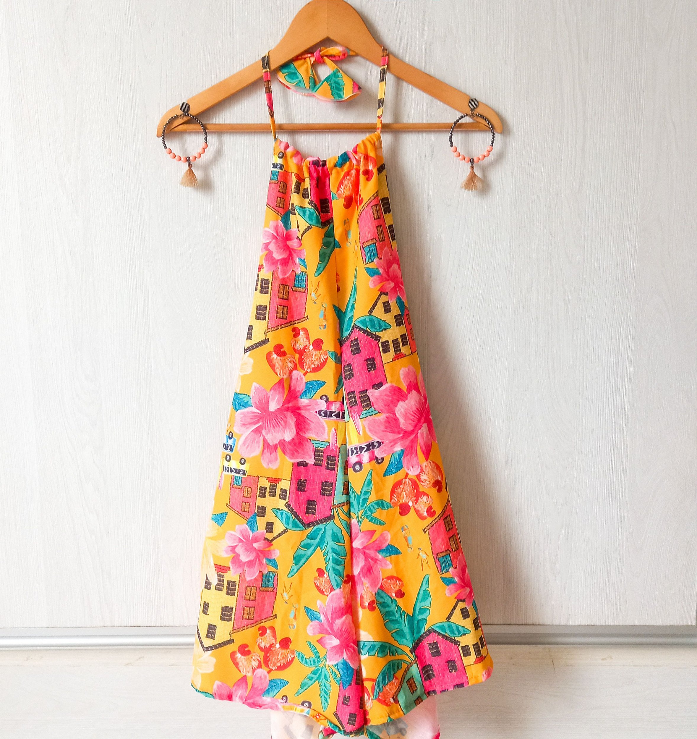 Macaquinho com faixa removível do mesmo tecido para amarrar no pescoço.